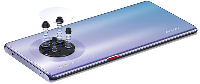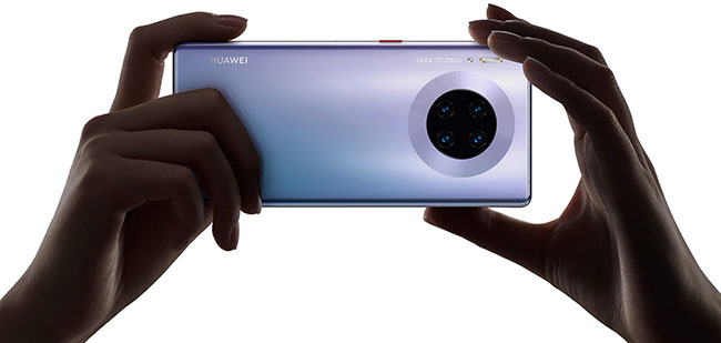 Aparat główny Huawei Mate 30 Pro wyposażony jest w potężny system czterech obiektywów w okrągłym układzie: główny 40 MP, szerokokątny 40 MP, teleobiektyw 8 MP i obiektyw 3D z wykrywaniem głębi. System ten wspierany jest przez technologię SuperSensing Cine Camera, a obiektyw główny i szerokokątny wyposażone zostały w superczuły sensor o wysokiej wartości ISO 512 000, który umożliwia rejestrowanie filmów o rozszerzonym zakresie dynamiki, a także w superzwolnionym tempie 7680 klatek na sekundę. Obsługuje także filmy poklatkowe 4K Ultra-Wide-Angle, nawet w bardzo słabym świetle.