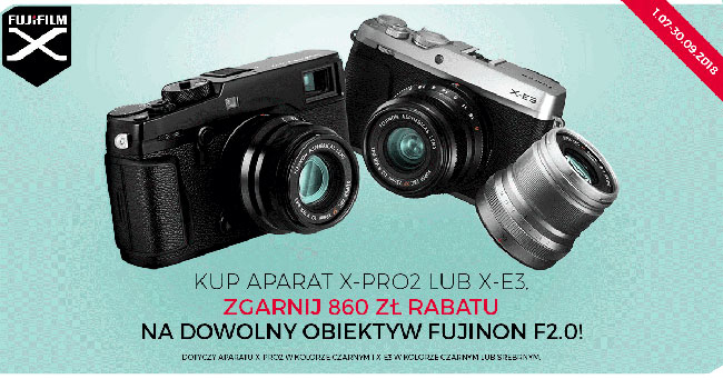 Jeśli klient kupi aparat X-E3 w srebrnej lub czarnej wersji kolorystycznej lub X-Pro2 w kolorze czarnym, otrzyma przy kasie rabat 860 zł na dowolny obiektyw Fujinon ze światłem f/2 do zrealizowania w momencie zakupu body.
