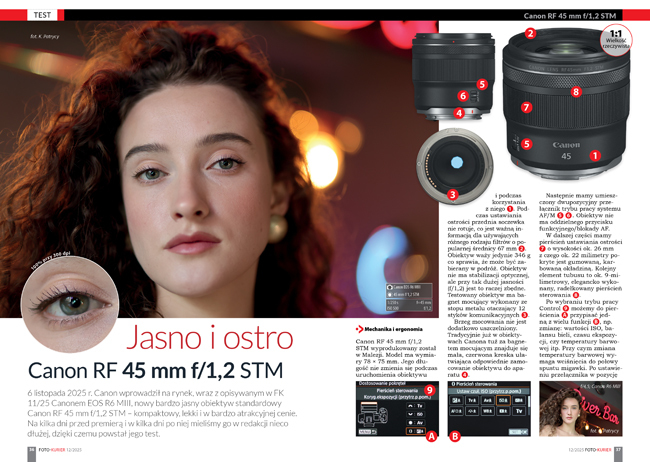 ![]() Test obiektywu Canon RF 45 mm f/1,2 STM - jasny standard w bardzo dobrej cenie 6 listopada 2025 r. Canon wprowadził na rynek, wraz z opisywanym w FK 11/25 Canonem EOS R6 MIII, bardzo jasny obiektyw standardowy Canon RF 45 mm f/1,2 STM – kompaktowy, lekki i w bardzo atrakcyjnej cenie. Na kilka dni przed premierą i w kilka dni po niej mieliśmy go w redakcji nieco dłużej, dzięki czemu powstał jego test. ![]() Autoportret świąteczny od kuchni - PRO STUFF i Łukasz Pietrzak - przerwa wakacyjna do 15 stycznia Wraz z Foto-Kurierem 12/25 rozpoczynamy kolejny cykl porad fotograficznych pt. "Kulisy jednego zdjęcia" przygotowany wraz z firmą PRO STUFF. Tym razem będzie to autoportret świąteczny od kuchni w wykonaniu Łukasza Pietrzaka, który wraz z nami i marką PRO STUFF życzy Państwu zdrowych, spokojnych, rodzinnych i zawsze ostrych w kadrze Świąt Bożego Narodzenia oraz samych udanych kadrów w 2026 r. Przy okazji informujemy, że w tym roku przerwa Świąteczna w Foto-Kurierze zakończy się 15 stycznia 2026 r. Wszelkie zamówienia będziemy realizować sukcesywnie. Dziękujemy za cierpliwość. DO SIEGO ROKU. ![]() Wydanie specjalne Foto-Kuriera 2/25 Aparaty - dostępne on-line Wydanie Specjalne Foto-Kuriera 2/25 (numer 43) poświęcone aparatom dostępne jest on-line. Od 23 grudnia powinno być obecne w salonach prasowych, do niektórych zostało już wysłane, ale póki co króluje poprzednie, nadal dostępne w naszym e-kiosku. Można je też zamówić bezpośrednio w redakcji (redakcja pokrywa koszt wysyłki w Polsce - realizacja po 15 stycznia), a także na stronie fotoforma.pl oraz w salonach Fotoforma w Warszawie i Foto-Plus w Krakowie (po 15 stycznia). Strona została zoptymalizowana w przeglądarkach: Mozilla Firefox > 3, Chrome, Internet Explorer > 7 oraz Opera. Polecana rozdzielczość ekranu 1280 x 1024 Polityka plików cookies | |