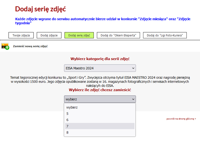 Przy wgrywaniu serii zdjęć do konkursu EISA MAESTRO koniecznie trzeba wybrać galerię tematyczną, do której będą przypisane wgrywane zdjęcia seryjne. Konieczny jest też tytuł serii zdjęć.