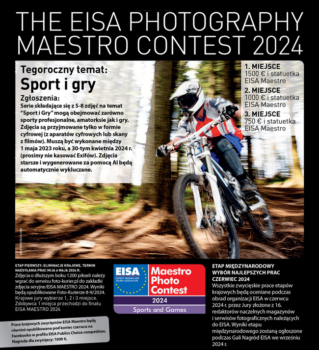 Zapraszamy do wzięcia udziału w konkursie EISA MAESTRO 2024 - "Sport i gry". Główna nagroda wynosi 1500 euro + 1000 euro w głosowaniu na Facebooku. Żeby wziąć udział w konkursie wystarczy wgrać do serwisu foto-kurier.pl do zakładki zdjęcia seryjne/EISA MAESTRO 2024 pliki o dłuższym boku maksymalnie 1200 pikseli (waga maks. 2 MB). Przy korzystaniu z Photoshopa zdjęcia najlepiej zapisać jako „Zapisz dla internetu” („Save for web”).