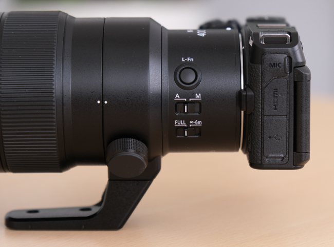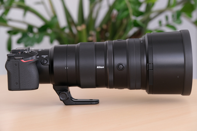 Nikkor Z 400 mm f/4,5 VR S ma nierozłączalną z korpusem stopkę mocowania obiektywu. Po zwolnieniu pokrętła (zdjęcie poniżej) wspomniany elemant można obrócić, ale nie można stopki odpiąć, gdyż mocowanie i poketło wykorzystano do zabepieczenia obiektywu przed migracją międzyludzką. Analogiczne rozwiązanie zastosowano w Nikkorze Z 800 mm f/6,3 >>>