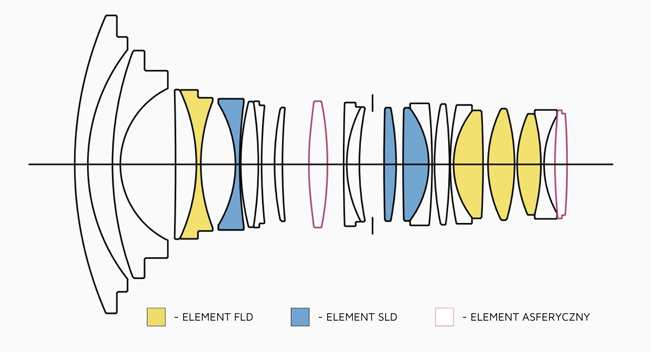 Układ optyczny obiektywu składa się z 21 elementów rozmieszczonych w 15 grupach, w tym mamy 4 soczewki FLD, 3 soczewki z niskodyspersyjnego szkła SLD oraz 2 soczewki asferyczne. Korygując odblaski komy i inne aberracje, obiektyw może precyzyjnie odwzorowywać jasne punkty świetlne w całym kadrze, nawet przy pełnym otwarciu przysłony, co czyni go idealnym do astrofotografii, którą wspierają również liczne dodatkowe funkcjonalności: