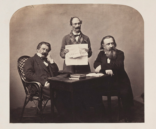 Portret Jakuba Piotrowskiego (stoi z egzemplarzem "Gazety Polskiej"), Ksawerego Szlenkiera (po lewej) i Karola Beyera (po prawej). Romantyk