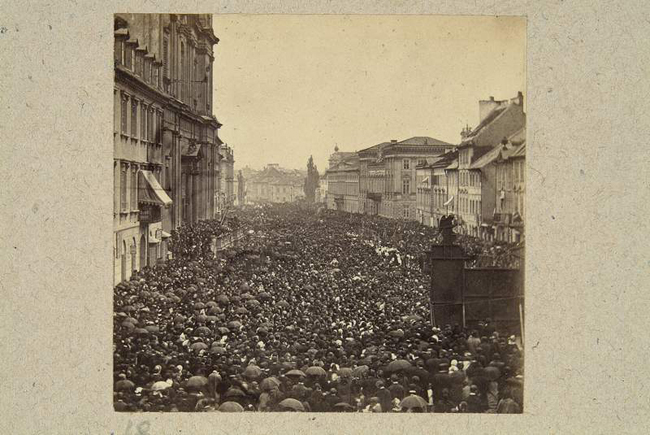 Warszawa. Procesja Bożego Ciała na Krakowskim Przedmieściu przed kościołem Św. Krzyża. fot. Beyer Karol (1818-1877)