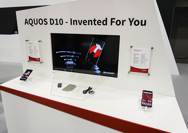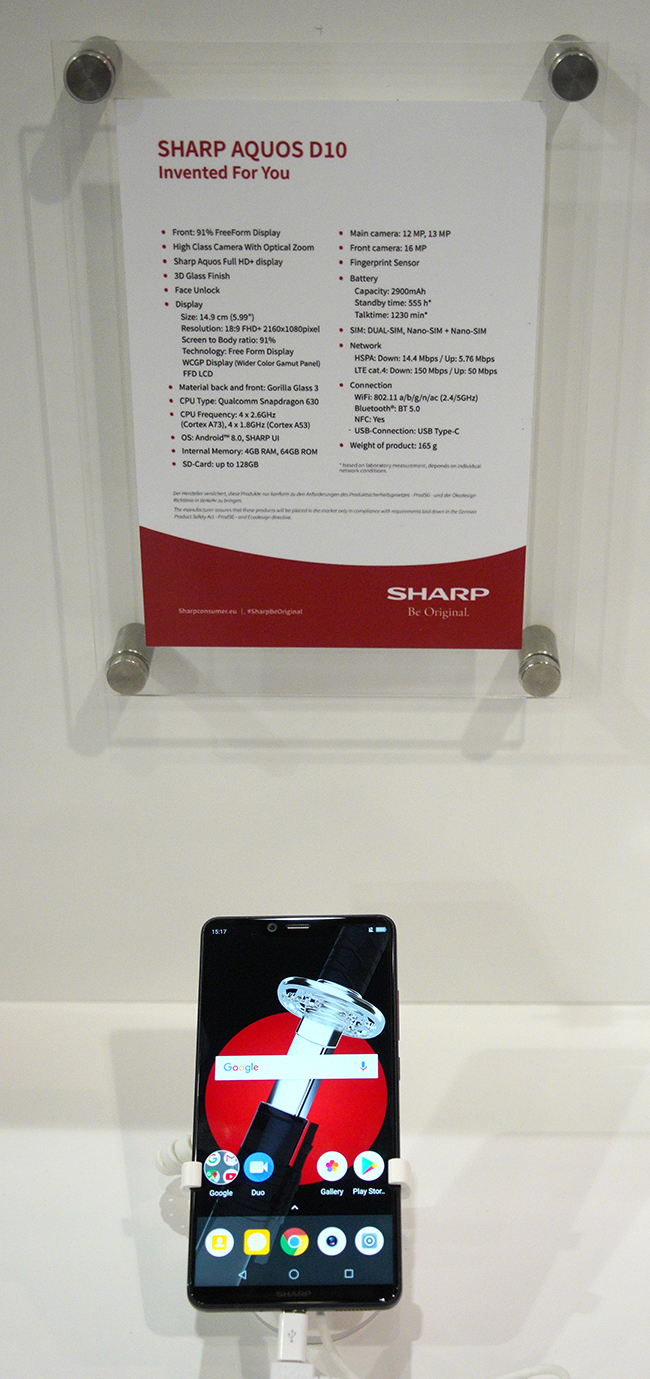 Na stoisku firmy Sharp sporym zainteresowaniem cieszył się smartfon Sharp Aquos D10 pracujący na systemie Android Oreo. Jest to średniej klasy smartfon, który ma kosztować w Europie nie więcej niż 400 euro. Sharp Aquos D10 ma 5,99-calowy ekran o rozdzielczości Full HD+ oraz procesor Qualcomm Snapdragon 630 z 4 GB pamięci RAM. Do przechowywania danych ma nam wystarczyć 64 GB pamięci wewnętrznej wspomaganej kartami microSD. Na pokładzie smartfonu Sharp Aquos D10 jest też podwójny aparat fotograficzny z 12 i 13 mmilionową matrycą i oświetlaczem LED. Nad ekranem jest 16 milionowa aparat do selfie. Całość zasilana jest z akumulatora o pojemności 2900 mAh. Więcej na temat telefonu znajdą Państwo w poniższej specyfikacji.