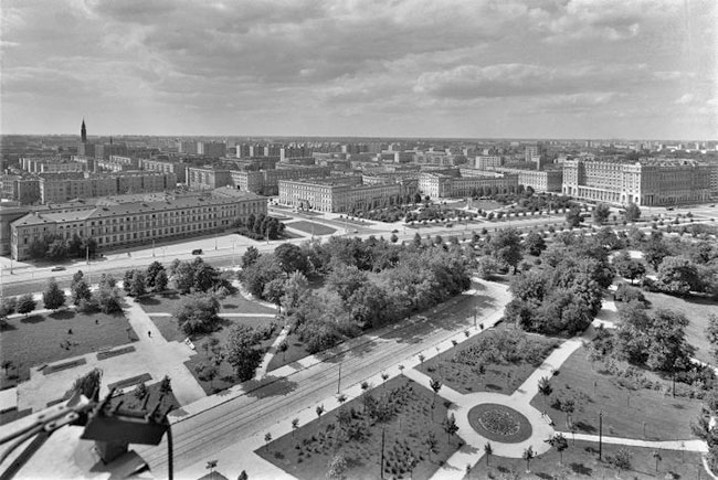 Warszawa, ok. 1965. Ogrod Krasińskich i ulica Nowotki (obecnie ulica Andersa), z lewej Pałac Mostowskich.
