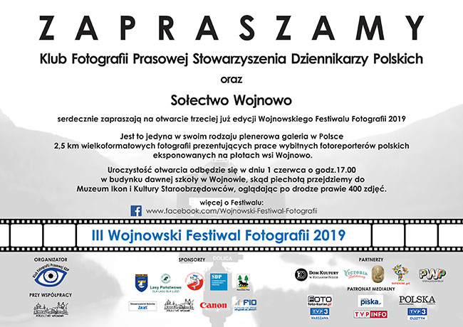 Klub Fotografii Prasowej Stowarzyszenia Dziennikarzy Polskich oraz Sołestwo Wojnowo serdecznie zapraszają na otwarcie trzeciej już edycji Wojnowskiego Festiwalu Fotografii 2019. Jest to jedyna w swoim rodzaju plenerowa galeria w Polsce. 2,5 km wielkoformatowych fotografii prezentujących prace wybitnych fotoreporterów polskich eksponowanych na płotach wsi Wojnowo.data dodania: 13-05-2019