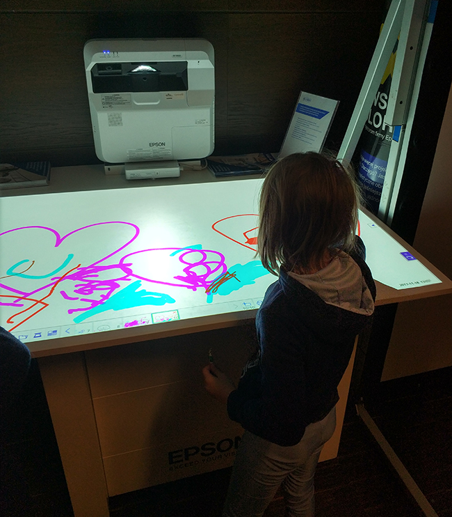 ![]() Kategorią, która paradoksalnie cieszyła się największym zainteresowaniem tak najmłodszych gości targów, jak i profesjonalistów biznesowych, były projektory interaktywne. Zbudowany na bazie modelu EB-1460Ui multimedialny stół edukacyjny wykorzystujący pakiet oprogramowania SMART pozwalał w praktyce docenić potencjał wykorzystania projektora jako narzędzia interaktywnej pracy grupowej oraz komunikacji. Rzutowanie zeń zmienia zwykłą powierzchnię np. ścianę czy blat w 100% interaktywną tablicę, a efekty pracy pozwala zapisać w celu przesłania mailem czy wydruku.