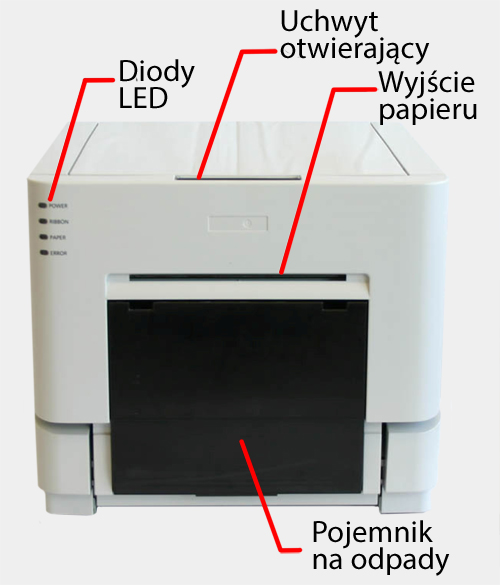 ![]() Drukarka termosublimacyjna DNP DS.-RX1 ma dość prostą budowę. W przedniej części znajduje się pokrywa załadunku materiałów eksploatacyjnych (folia, papier) oraz kaseta odbierająca wydruk, pojemnik na ścinki oraz cztery wskaźniki: Power, Ribbon (taśma), Paper, Error informujące nas o stanie urządzenia.