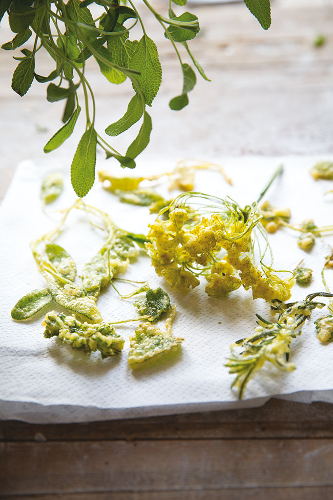 ![]() Fot. Kinga Błaszczyk – Wójcicka Świeże gałązki ziół usmażone w tempurze, fotografowane na starej desce ustawionej w otwartym oknie. Zdjęcie powstało na zlecenie magazynu Weranda Country.