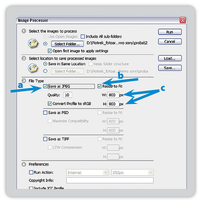 ![]() W punkcie 3 wybieramy docelowe: format, jakość, i wielkość zdjęć. Nas interesuje JPEG, więc zaznaczamy „Save as JPEG” (Zapisz jako JPEG, strzałka „a”); jeśli chcemy je zmniejszyć do wyświetlania w Internecie, zaznaczamy „Resize to Fit” (Dostosuj rozmiar, strzałka „b”), wpisując w pola niżej wartości – w pikselach – nas interesujące. Do wykorzystania w Internecie proponujemy wpisać w pola W (Sz) i H (Wys) po 800 pikseli (strzałka „c”), taki format mają np. zdjęcia wyświetlane w galerii internetowej na www.foto-kurier.pl. W pole Quality (Jakość) proponujemy wpisać 10 (do Internetu w zupełności to wystarczy, maksymalna wartość to 12). Aparat domyślnie rejestruje zdjęcia w profilu sRGB, ale dla pewności zaznaczamy opcję „Convert Profile to sRGB” (Konwertuj profil na sRGB).