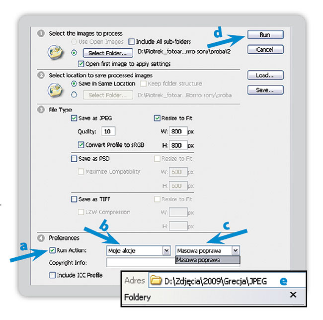 W 4 punkcie wybieramy akcję (zadanie), którą wykonaliśmy w pierwszych krokach. Zaznaczamy opcję „Run Action” (Uruchom operację, strzałka „a”). Z pierwszego pola (strzałka „b”) wybieramy „Moje akcje” (Set/Zestaw, który ustawiliśmy w kroku 2), a z drugiego (strzałka „c”) akcję z kroku 3 (zrobiliśmy jedną, więc nie mamy wyboru) – „Masowa poprawa”. Gdy już wszystko ustawimy, wciskamy „Run” (Uruchom, strzałka „d”) na górze okna i Photoshop zaczyna „mielić” fotografie. Po zakończeniu – jeśli nie wskazaliśmy innej lokalizacji w kroku 8 – pojawił się folder domyślnie nazwany „jpeg” (tam, gdzie oryginalne pliki, zrzut „e”), z nowymi zdjęciami po przeróbce. Tekst i zdjęcia: Piotr Borys Artykuł opublikowano w Foto-Kurierze 9/2009 data dodania: 25-05-2017