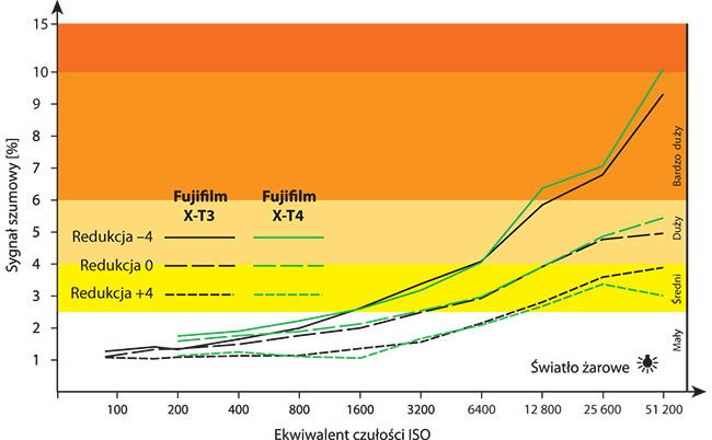 Fujifilm X-T4, tak jak poprzednik (X-T3) ma 9 poziomów odszumiania, od –4 do +4. Ciężko w takim razie stwierdzić czy poziom –4 to jest małe odszumianie czy nie ma go w ogóle. W X-T3 jest podobnie. Na poziomie odszumiania –4 (najmniejsze) aparat z szumami radzi sobie bardzo dobrze. Od ISO 1600 pojawia się lekkie zaszumienie (patrz wykresy), które staje się bardziej intensywne dopiero po przekroczeniu ISO 3200.