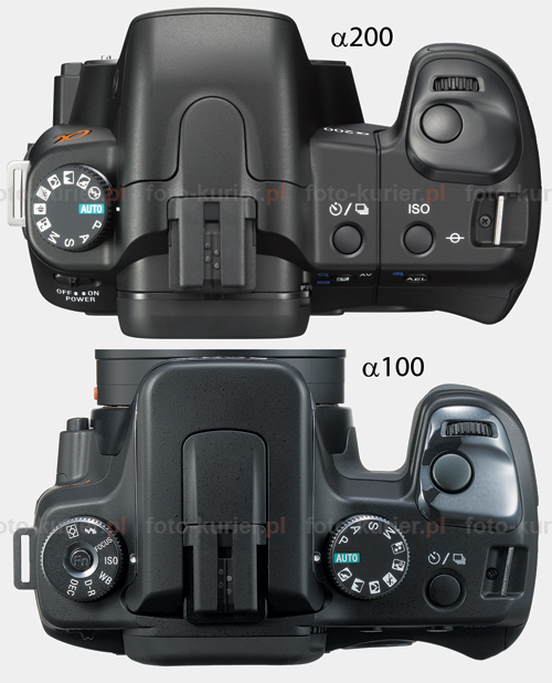 Z zewnątrz Skłonność do miniaturyzacji, typowa dla produktów Sony, dotknęła również i nową lustrzankę. a200 cechuje się niewielkimi wymiarami (130,8×98,5×71,3 mm), przez co wydaje się być bardziej elegancką, choć w eleganckości tej przeszkadza nieco szorstkie w dotyku tworzywo sztuczne, z którego wykonano korpus aparatu. Niestety, takie wykończenie jest typowe dla produktów konsumenckich. Pod względem materiałów wykończeniowych aparat nie różni się więc od poprzednika. Nowa alfa jest nieco węższa i niższa od modelu a100. Jej korpus ma też o wiele więcej zaokrągleń. Z prawej strony górnej części a200 pokrętło wyboru trybów przeniesiono na stronę lewą, a w jego miejsce wstawiono dwa przyciski: wyboru częstości ekspozycji i doboru ekwiwalentu czułości ISO.