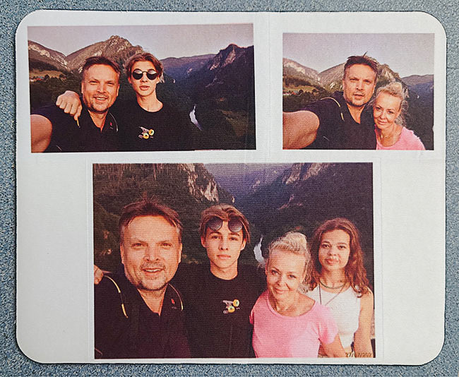 ![]() Wydruki z testowanej drukarki można stosować do zadrukowania podkładki pod mysz. Można przy tym tworzyć różnego rodzaju kolaże. Jednak pamiętajmy, żeby np. układanych zdjęć nie nakładać na siebie, gdyż powstaną na oryginale różnego rodzaju ramki, które mogą nam się niezbyt podobać, ale z drugiej strony mogą też stanowić element celowej działalności twórczej. Poniżej prezentujemy powyższą mozaikę zdjeciową przygotowaną do włożenia do prasy celem transferu zdjęć na podłoże.