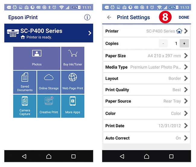 Wspomniana apka jest dość intuicyjna w obsłudze. Umożliwia zmianę formatu papieru do A3+(329×483 mm) oraz wybór jego rodzaju. Możemy też wybrać ilość wykonywanych kopii, kontrolować poziom tuszy [7] oraz stan techniczny drukarki [8]. Drukowaliśmy na P400 za pomocą telefonu z systemem Android (Sony Xperia Z3+) i bezpośrednio z iPada.