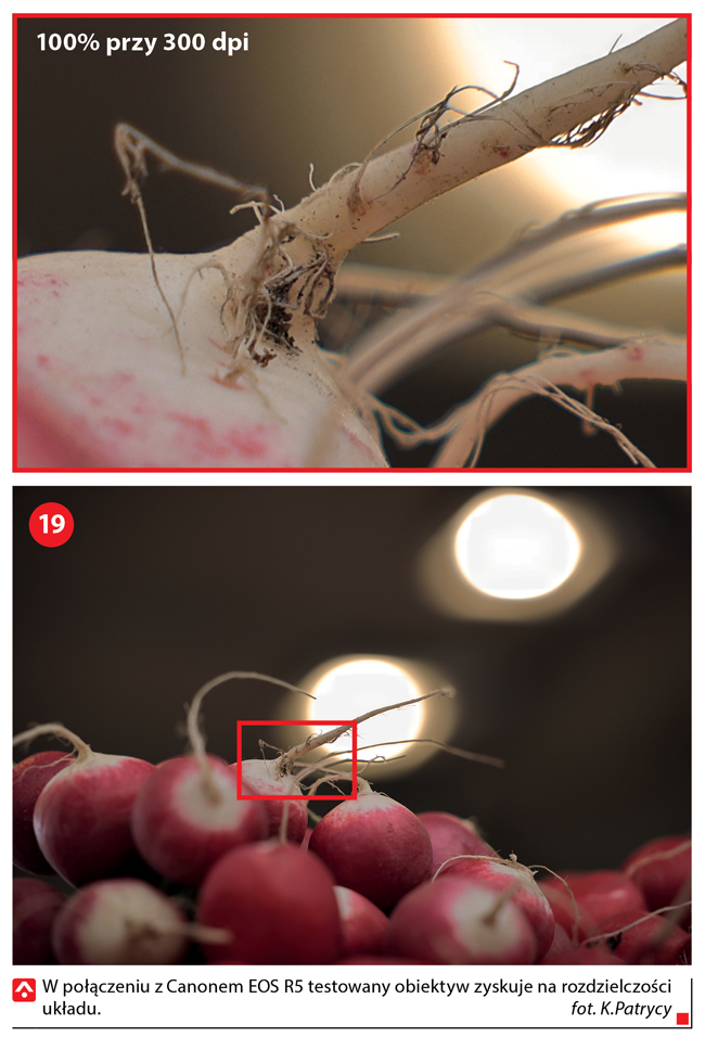 Jego kształt jest regularny, bez tzw. efektu cebuli (19). Kąty widzenia dla obiektywu w poziomie wynoszą 23° 20′-84° Za system ustawiania ostrości odpowiadają dwa silniki Canon Nano USM. Obiektyw ma też funkcję elektronicznego ustawiania ostrości parafokalnej i tłumienia „oddychania” obiektywu w celu utrzymania stałego pola widzenia podczas nagrywania materiału wideo. Jasność f/2,8 pozostaje stała w całym zakresie ogniskowych, dzięki czemu nie występują zmiany czasu otwarcia migawki ani czułości ISO podczas zmiany ogniskowej. System w połączeniu z Canonem EOS R5 działa sprawnie i efektywnie.