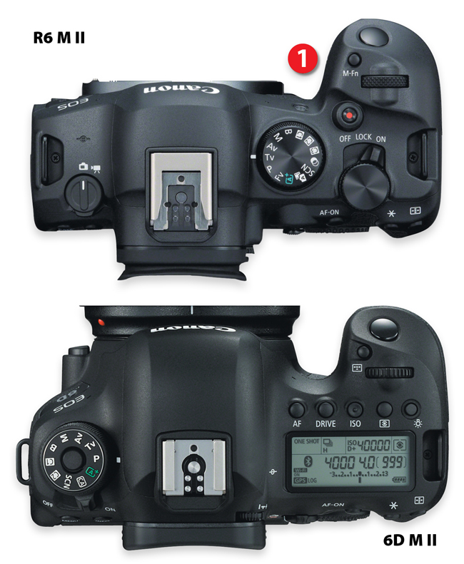 Zmian użytkowych jest naprawdę dużo. Zabrakło w R6 M II wyświetlacza monochromatycznego, a przyciski wyciągnięte dotychczas wokół niego „schowano” pod przyciskiem M-Fn (1). Każde jego wciśnięcie wywołuje jedną z funkcji tj. balans bieli, tryb AF, ISO, korekcję ekspozycji w zakresie +/–3 EV itd., które zmieniamy za pomocą pokręteł górnego lub tylnego.