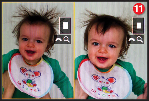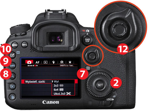 Układ przycisków pozostał w zasadzie na tym samym miejscu, zmieniły się role niektórych z nich. W miejscu przycisku RAW/JPEG powędrował przycisk INFO, szybkie wejście do zmiany głównych parametrów ekspozycji Q zostało przeniesione na prawą stronę ekranu LCD [7] (tak jak w większości aparatów systemu EOS), a w jego miejscu pojawił się przycisk MENU, oraz oddzielny przycisk do powiększania zdjęć [8] (oraz ustawiania ostrości w trybie Live View) i przycisk RATE do oznaczania zdjęć [9] . W zamian za przycisk Picture Styles pojawił się Creative Buttom [10], dzięki któremu mamy teraz dostęp nie tylko do stylów obrazu, ale i do wielokrotnej ekspozycji oraz do trybu HDR. Gdy przełączymy aparat w tryb odtwarzania przyciskiem tym zestawimy obok siebie dwa zdjęcia [11]. Dzięki temu łatwiej z poziomu aparatu wybierzemy najlepsze ujęcia. Jest to bardzo przydatne przy przeglądaniu zdjęć wykonywanych w serii.