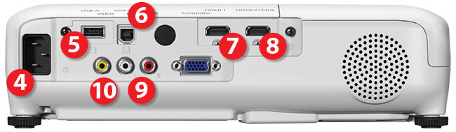 Tradycyjnie już wszystkie złącza zlokalizowane są z tyłu projektora. Oprócz typowego „komputerowego” gniazda zasilania [4] mamy tutaj złącze USB 2.0 typu A [5], złącze USB 2.0 typu B [6], wejście VGA, 2 wejścia HDMI [7] [8], wejście sygnału kompozytowego [9], MHL [8] (kiedy projektor jest włączony, możliwe jest np. ładowanie urządzenia mobilnego przez za pomocą specjalnego kabla MHL) oraz wejście audio [10] typu cinch. Opcjonalnie można też skorzystać z bezprzewodowej sieci LAN IEEE 802.11b/g/n.