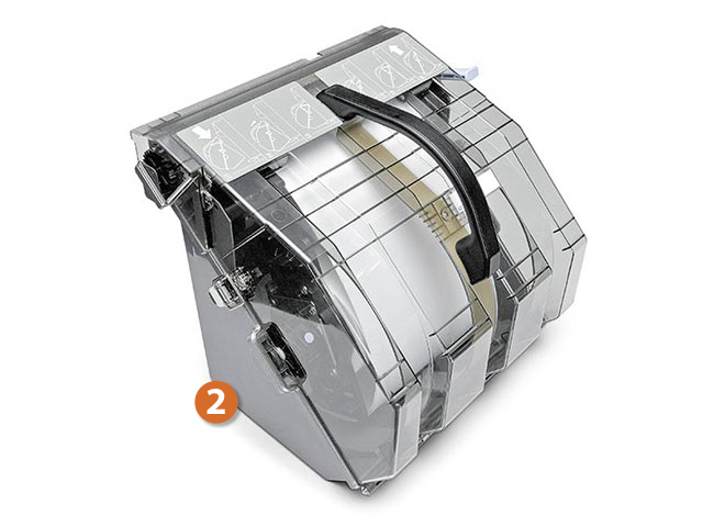 Łatwo dostępne kartridże z tuszem. Mogą być wymieniane podczas pracy maszyny, bez konieczności zatrzymywania produkcji.