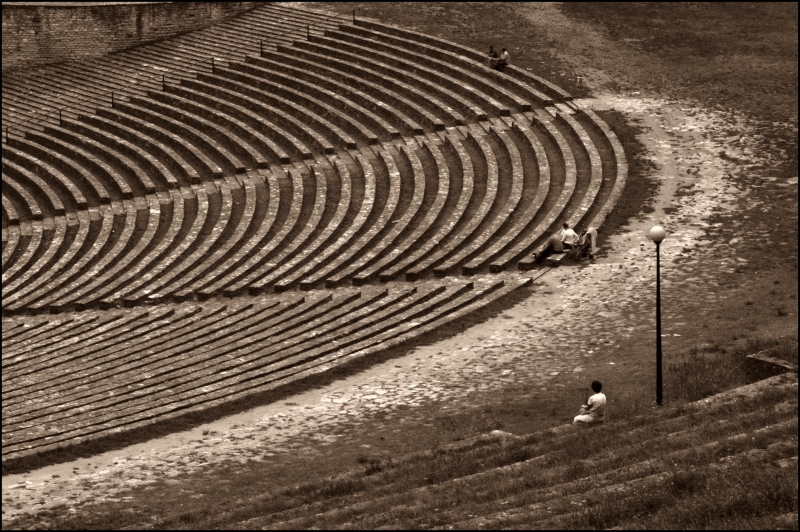 Lampa i siedzący przy niej człowiek ujęci w mocnym punkcie rzeczywiście ubarwiają zdjęcie (fajny tytuł), pozostałe osoby łatwo można wyklonować (i ja bym tak zrobiła ale to oczywiście decyzja Autora)... no i może ciut przycięłabym górę (jasny rant murku w lewym górnym rogu kadru).