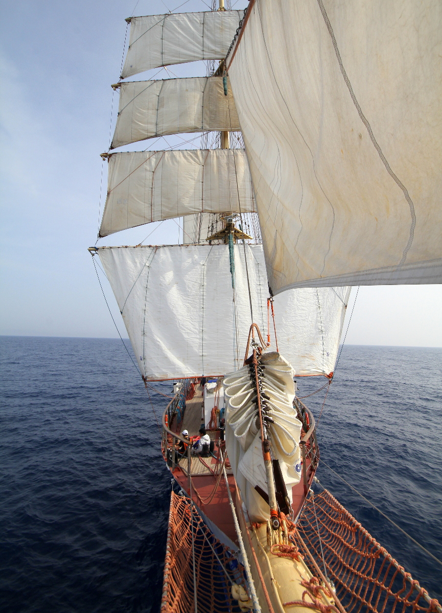 POGORIA w rejsie po Morzu Śródziemnym. Zdjęcie zrobione z noku bukszprytu. Dalej stanąć z aparatem już się nie dało