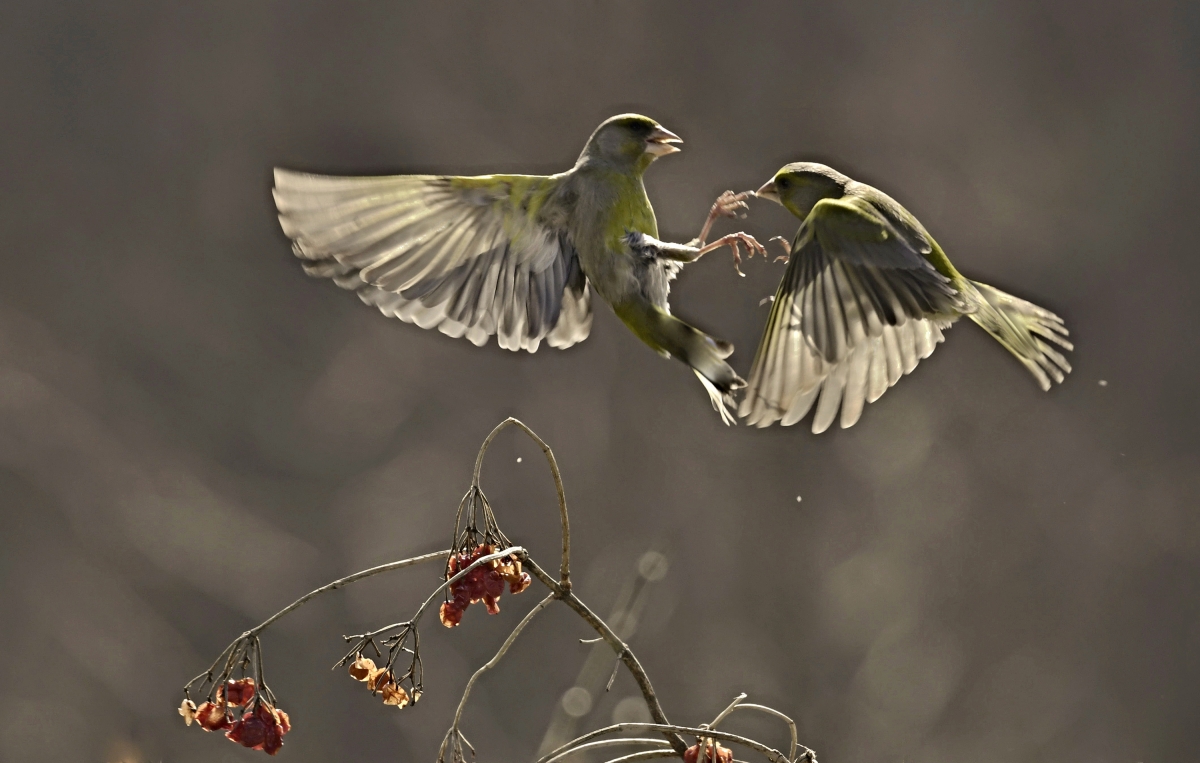 testowe Popis , czy sprzeczka ? Zawsze słyszałam , że te wróblowate dzwońce to wielkie hulaki. Nigdy mi się jednak nie śniło „zapolować” na taką rozróbę. Aż tu pewnego razu dzwońce zsiadły na kalinie. Ich zielone upierzenie świetnie kontrastowało z czerwonymi kuleczkami krzewu . Początkowo zgodnie siedziały i ni stąd ni zowąt zaczęły na siebie syczeć, aż w pewnym momencie wzniosły się ku niebu. Awanturowały się, aż pierze leciało. Później przeczytałam, iż to rodzaj popisu przed swoją wybranką w okresie godowym, aby zaprezentować swoją siłę i odwagę, by wzbudzić zachwyt samiczki. Parametry techniczne: Nikon D 500 , Nikkor 70-200 VR1/ /3200s, F 6,3 ISO 2000, f 320mm Aparat: NIKON CORPORATION; Model: NIKON D500; Przysłona: f/5,6; Czas ekspozycji: 1/2000 s; ISO: 800; Ogniskowa: 290 mm; © fot. Inka Wieczenska data dodania: 31-08-2022