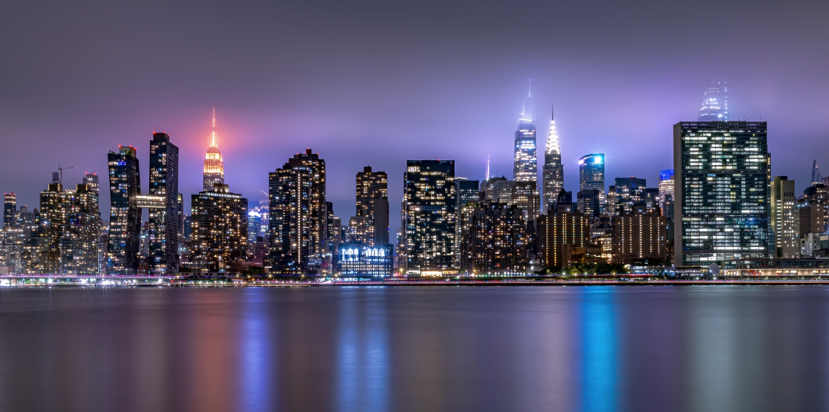 Wieczorny widok na zamglony Manhattan z Queens.