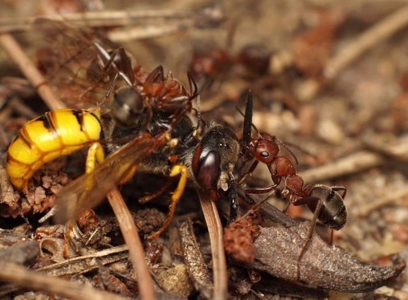 Zdjęcie przyrodnicze przedstawiające atak mrówek na osy w naturalnym środowisku. Zapraszam.