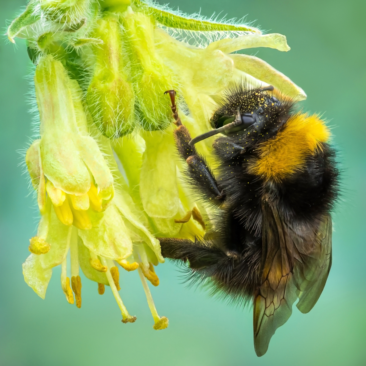Przyczepiony Trzmiel ziemny (Bombus terrestris) złapany na kwiecie jagody kamczackiej podczas pobierania nektaru (Trzmiele ziemne posiadają krótsze języki dlatego dłuższe kwiaty stanową dla nich przeszkodę, zdjęcie przedstawia idealny przykład co taki trzmiel robi gdy chce pozyskać nektar z takiego kwiatu - wgryza się u nasady "podbierając" pokarm "na skróty", to już tłumaczy skąd się biorą te małe dziurki w płatkach) Parametry techniczne: TOKINA AT-X PRO D MACRO 100M F/2.8 + Raynox DCR-250, stos obrazów +/- 70 zdjęć Aparat: NIKON CORPORATION; Model: NIKON D7500; Przysłona: f/11,0; Czas ekspozycji: 1/320 s; ISO: 800; Ogniskowa: 100 mm; © fot. Kamil Górawski data dodania: 21-02-2024