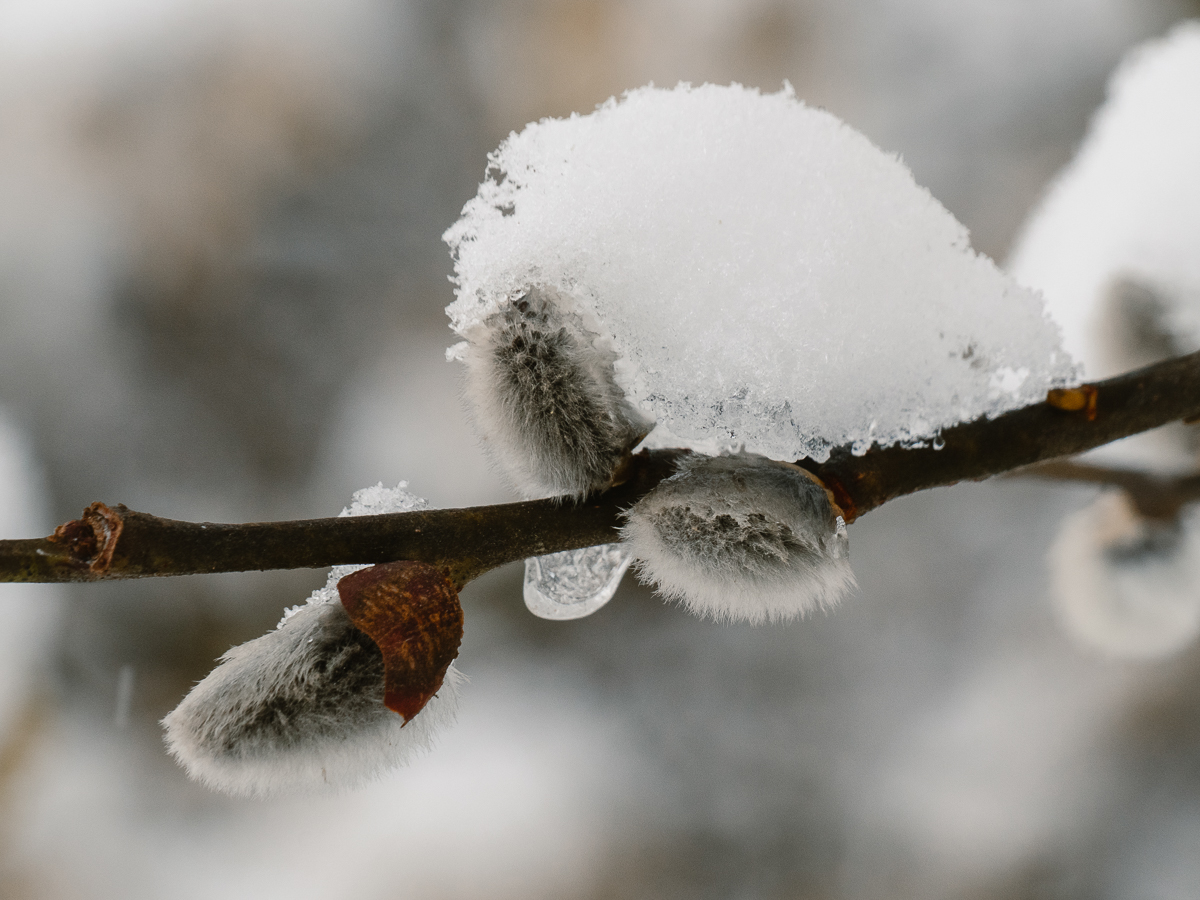 Przysypane śniegiem wiosenne bazie tzw. kotki.