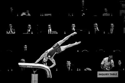 Zawodnik Dmitrii Lankin (RUS) wykonuje skok przez stół gimnastyczny na oczach sędziów podczas Mistrzostw Europy w Gimnastyce Sportowej w Szczecinie