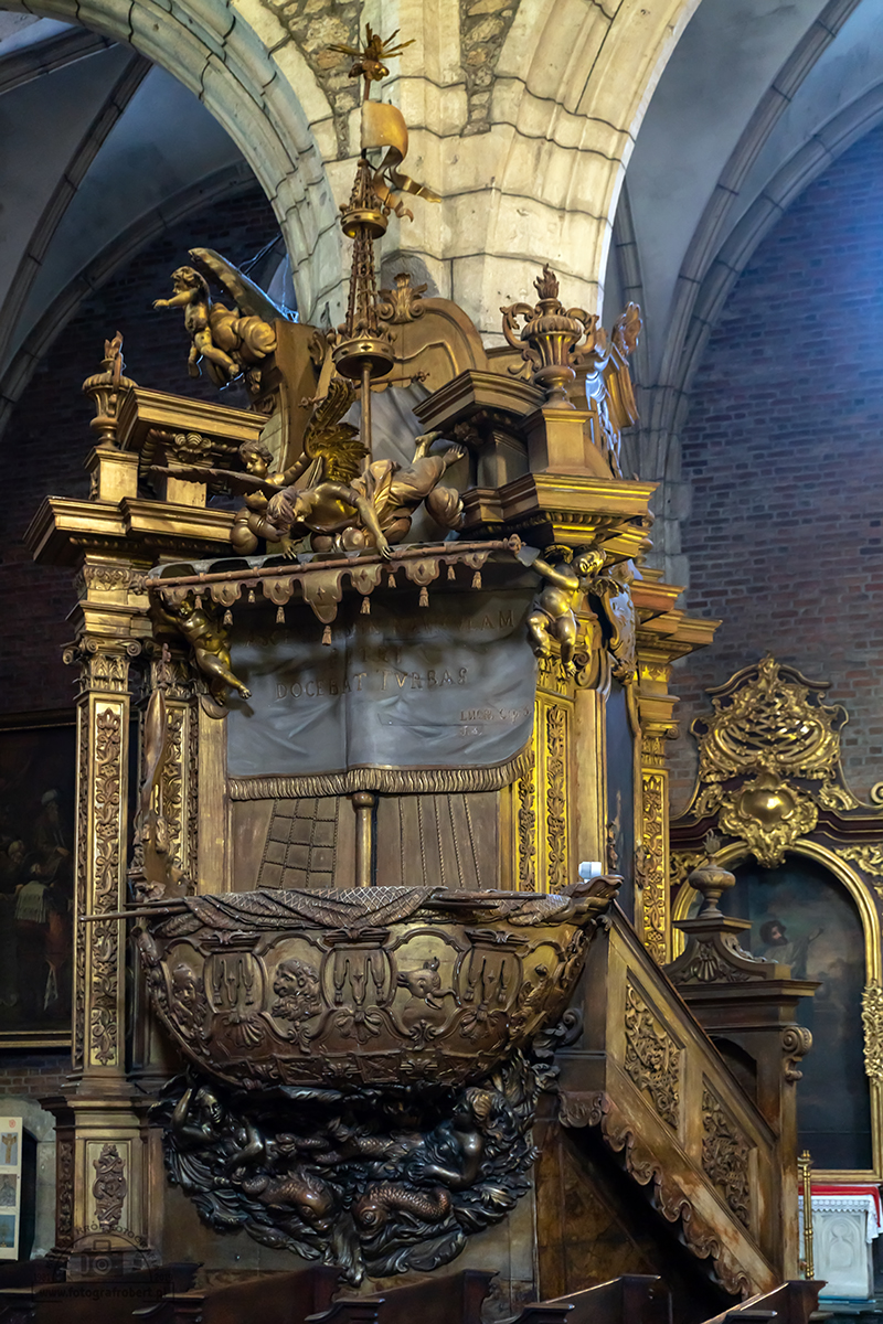 testowe Bazylika Bożego Ciała w Krakowie - ambona Ambonę wzniesiono w latach 1744-1750 z fundacji prepozyta Piotra Procewicza. Ma ona oryginalny kształt łodzi unoszonej na falach morza, zaopatrzonej w sieci, wiosła, maszt, żagle..... Parametry techniczne: Aparat: SONY; Model: ILCA-99M2; Przysłona: f/3,2; Czas ekspozycji: 1/40 s; ISO: 2000; Ogniskowa: 45 mm; © fot. Robert Król data dodania: 24-02-2019