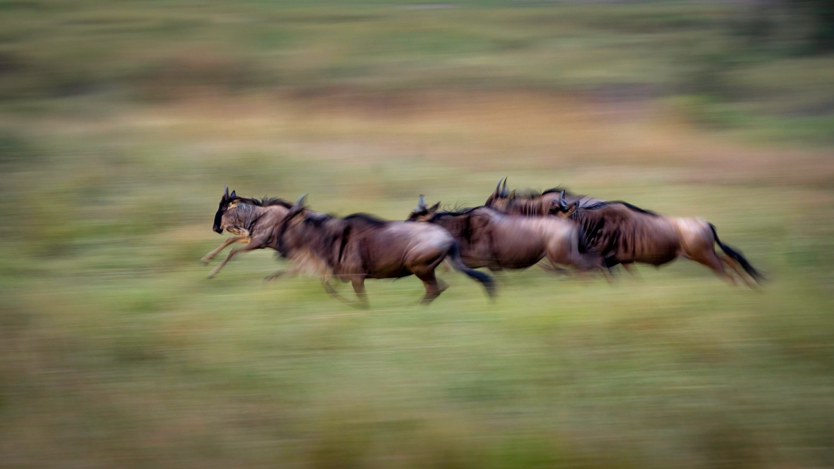 Podczas Wielkiej Migracji w Serengeti w Tanzanii stada antylop gnu (Connochaetes taurinus) są wszechobecne. Pasą się leniwie, próbują przeprawić się przez rzekę, uciekają przed drapieżnikiem lub pędzą bez widocznego powodu. Łączą się w wielkie stada ale bez problemu można w nich wyodrębnić mniejsze grupki zapewne powiązane więzami rodzinnymi. Na zdjęciu taka mniejsza grupka próbująca dogonić większe stado.
