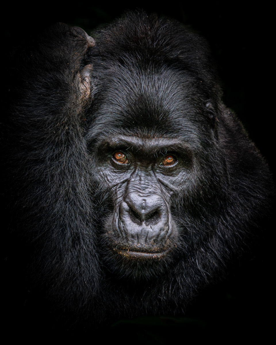 Portret tego goryla zrobiłem w Nieprzeniknionym Lesie Bwindi w Ugandzie. To bardzo trafna nazwa, ponieważ, gesty pierwotny las deszczowy był mroczny i trudno dostępny. To właśnie w tym lesie swoją ostoję znalazły te dumne naczelne. To było niesamowite przeżycie móc przebywać wśród nich w ich naturalnym środowisku. Budziły w nas szacunek nie tylko swoją siłą i rozmiarami ale też widoczną w swoim zachowaniu i spojrzeniach inteligencją. To naprawdę nasi bliscy krewni…