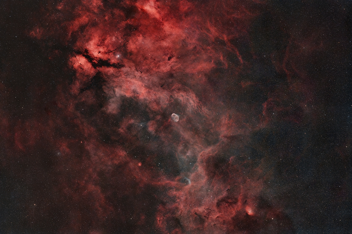 Mgławice w gwiazdozbiorze Łabędzia. W centrum kadru znajduje się mgławica NGC 6888 Rożek, prezentowana w Foto Kurierze 10/2025 w nieco większym zbliżeniu, Myślenice, Polska, listopad 2025