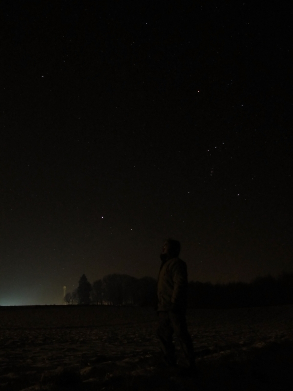 Bardzo Fajny kadr!!! Panie Mirosławie przepraszam że coś zasugeruję. Jeśli posiada Pan zewnętrzną lampę błyskową ,warto by spróbować następnym razem ustawić aparat z przysłoną coś koło F=22(lub większą) z czasem 30sek. lub dłużej. Błysnąć lampa za kadru (od strony w którą patrzy osoba pozująca),to powinno wystarczyć by ukazać postać. A dłuższy czas naświetlania wyciągnie niebo,wysoka wartość przysłony nie wpłynie na niedoświetlenie postaci (ponieważ oświetli Pan ją błyskiem).Postać będzie „zamrożona”,ale będzie dobrze gdy pozostanie w tej samej pozycji do końca naświetlania gdyż z tyłu ma pan światła. Jeśli chodzi o ostrość najlepiej ustawić na osobę pozującą. Wysoka przysłona z powoduje wykorzystanie tzw. ostrości hiperfokalnej(wykorzystywanej w fotografii pejzażowej). Nie daję głowy że punkty na niebie będą nieruchome. Ziemi nie da się zatrzymać :) Naprawdę podoba mi się to zdjęcie :)Przepraszam za moją rozbudowaną poradę. Pozdrawiam.