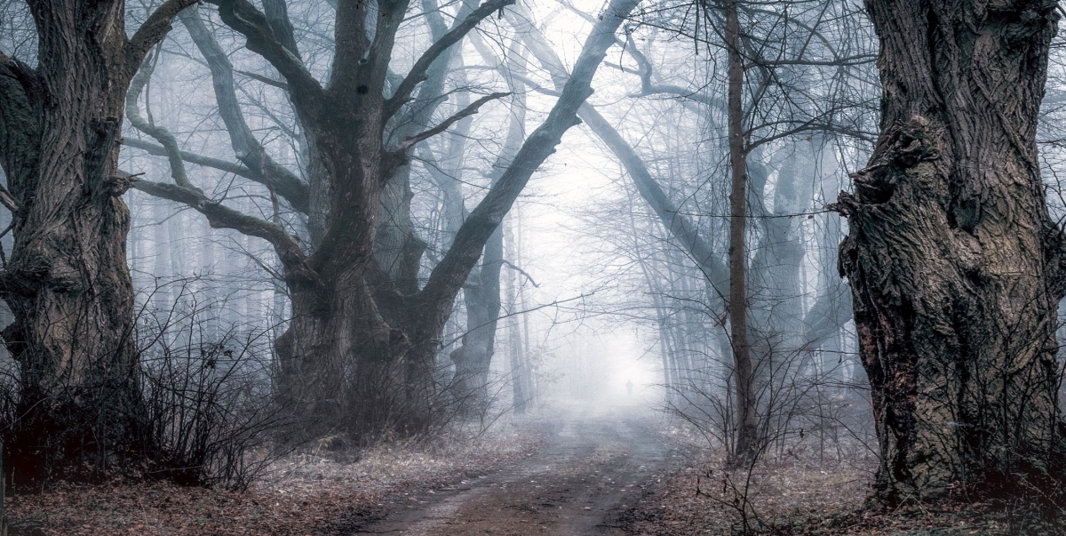 Człowiek w mglistym jesiennym lesie