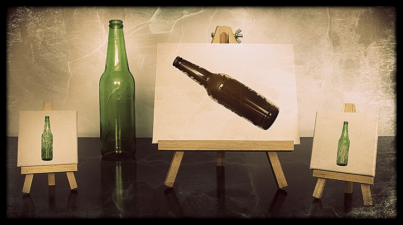 W odpowiedzi na Pańskie zapytanie z PW. Kolejne zdjęcie ładnie stylizowane. Pomysły ma Pan kreatywne i liczne. Trzeba uważać na niebezpieczeństwo maniery w stylizacjach. W tej fotografii najbardziej przeszkadza ostra linia pomiędzy stołem a ścianą. Może lepiej żeby taka linia nie odciągała uwagi od prezentowanej martwej natury np w stylu stołu bezcieniowego. Może też lepiej gdyby było obecne całe odbicie butelki z lewej oraz stonowane bliki na większych butelkach.