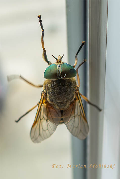 Na zdjęciu prawdopodobnie bąk (muchówka z rodziny bąkowatych). Charakteryzuje się dużymi połyskującymi oczami. Krwiopijca. \AI nie zawsze prawdę mi powie\.