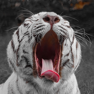 Zdjęcie zrobione w ZOO Borysew.Białe tygrysy bengalskie występują głównie w niewoli. Dziko żyjące tygrysy bengalskie można znaleźć w Indiach, Bangladeszu, Nepalu, Bhutanie i Myanmarze, ale biały kolor jest rzadkością. Tygrys na zdjęciu z paszczą szeroko otwartą robi niesamowite wrażenie choć tak właściwie ziewał.