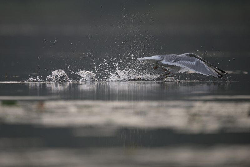 Mewa siwa złapana w kadrze w momencie ataku na rybkę. Zdjęcie pozwala zauważyć akrobatyczne ułożenie jej ciała podczas ataku, w szczególności pozostawioną w tyle głowę, którą wyprzedziły już skrzydła.