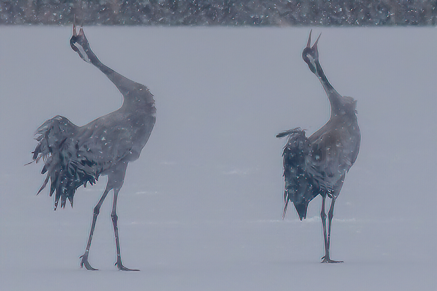 testowe Śnieżne gody żurawi. Parametry techniczne: Aparat: Canon; Model: Canon EOS 7D Mark II; Przysłona: f/6,3; Czas ekspozycji: 1/2500 s; ISO: 640; Ogniskowa: 400 mm; © fot. Andrzej Pietruszczak data dodania: 07-03-2023