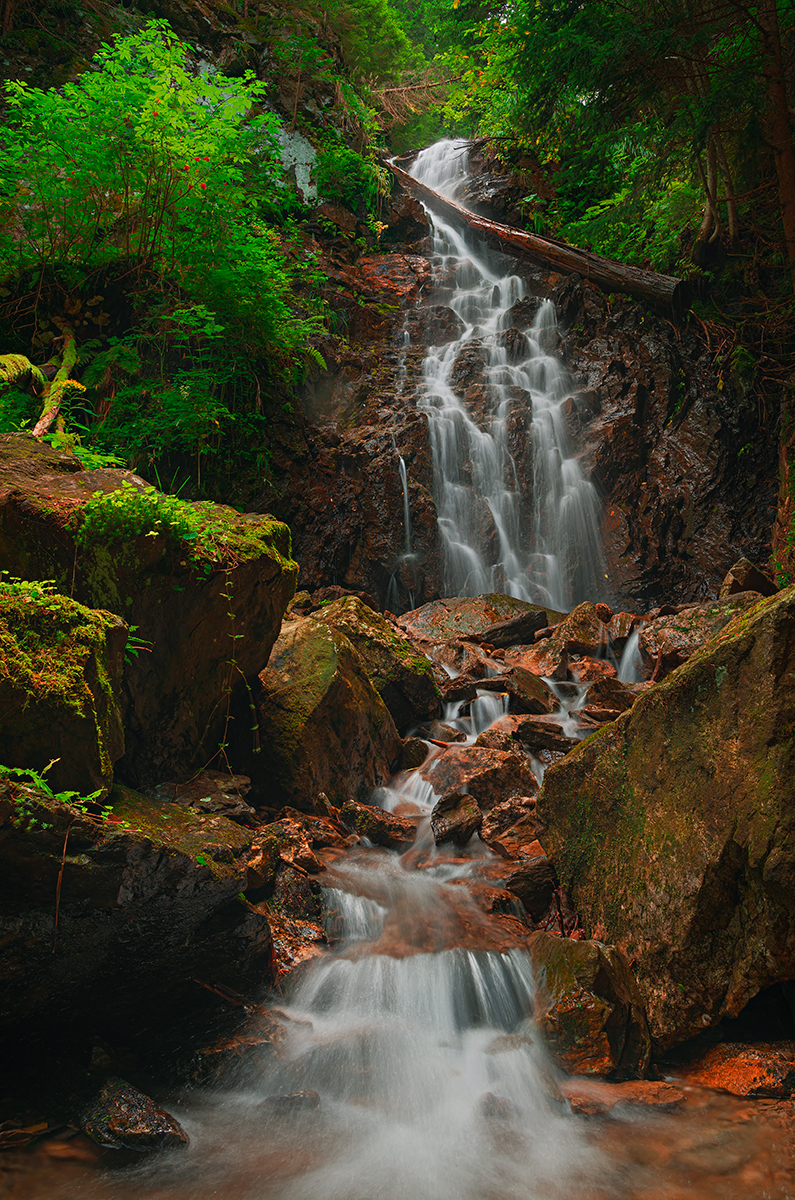 Urokliwy leśny potok, wyrazisty kolor głazów i ładne rozmycie (zamrożenie) wody itd.