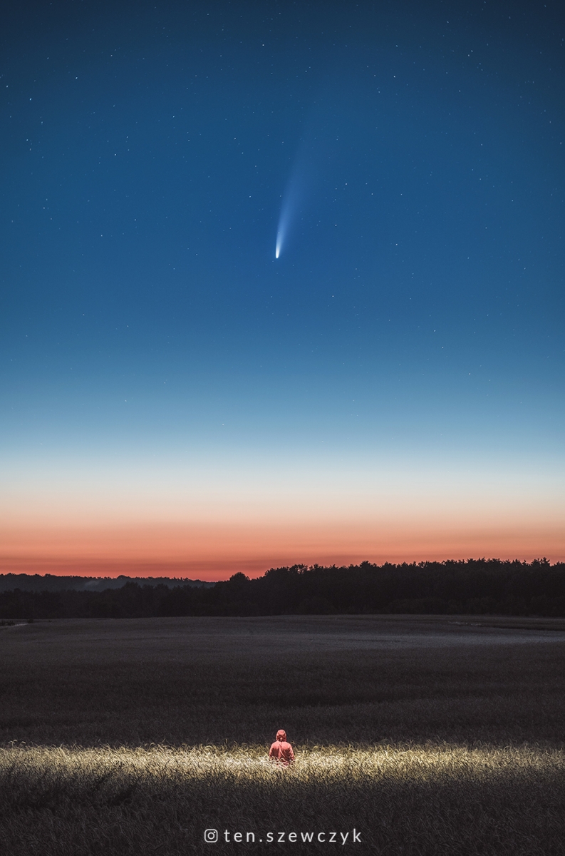 testowe Spotkanie Kometa C/2020 F3 Neowise uchwycona nad polem na obrzeżach Poznania. 12.07.2020 zapowiadała się bezchmurna, więc postanowiłem wybrać się obserwację nocnego nieba i słynnej już komety Neowise. Udało mi Parametry techniczne: Sony a7III + Samyang 85mm f/1.4 © fot. Przemysław Szewczyk data dodania: 13-07-2020