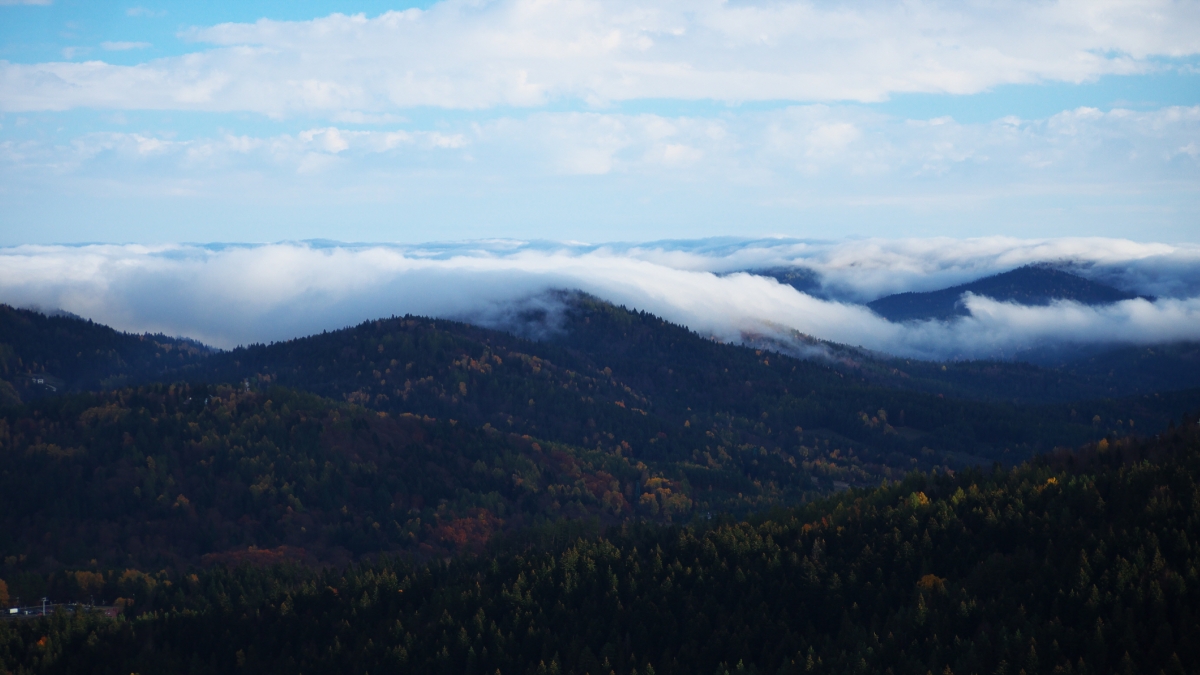 Snujące się mgły jesienne po górach Beskidu , na wschód od Krynicy-Słotwiny. Widok z wieży widokowej.