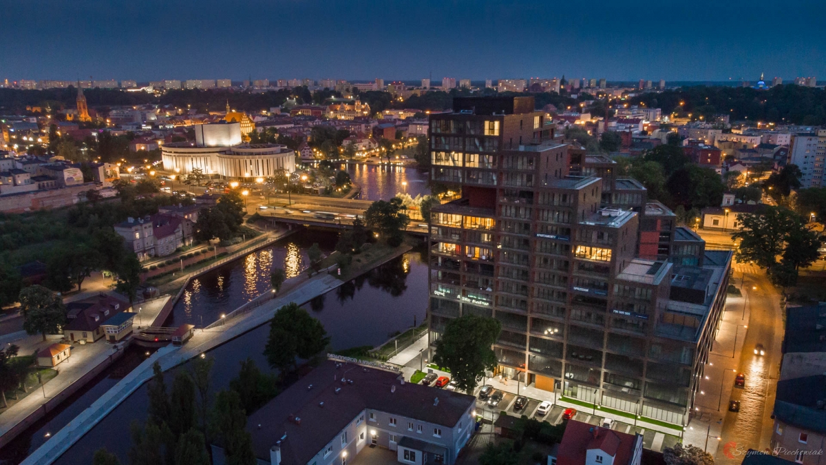 Zdjęcie przedstawia centrum Bydgoszczy z wyróżniającymi się budynkami Nordic Haven oraz Operą Nova.