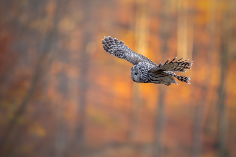 testowe Puszczyk uralski na jesiennym, ognistym tle Parametry techniczne: f2,8 iso 640, tv 1/1000, -0,03 ev © fot. Patryk Sacharewicz data dodania: 01-11-2022